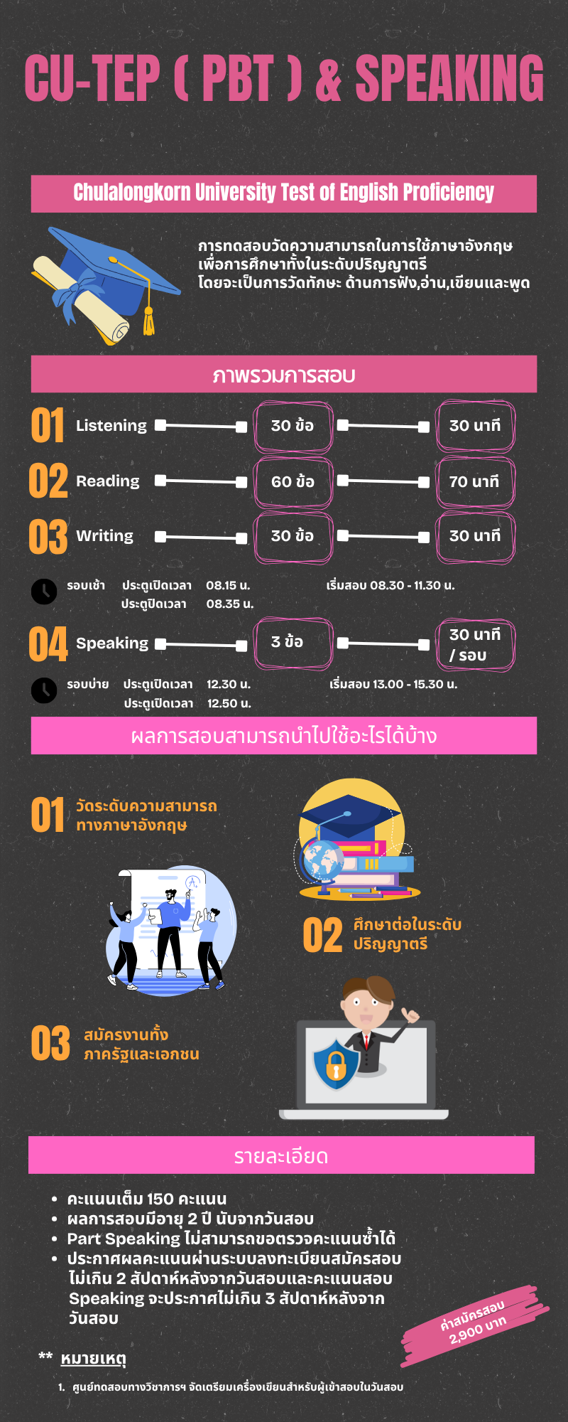 ขั้นตอนการสมัครสอบ อ่านขั้นตอนการสมัครสอบ คลิกที่นี่ ข้อปฏิบัติสำหรับผู้เข้าสอบ หลักฐานการแสดงตนเพื่อเข้าสอบ การแต่งกายในวันสอบ คลิกเพื่ออ่านรายละเอียด เข้าสู่ระบบ สมัครสอบ ตรวจสอบสถานที่สอบ หรือตรวจสอบผลคะแนน เข้าสู่ระบบ ดาวน์โหลด ดาวน์โหลดรอบการสอบประจำปี คลิกที่นี่