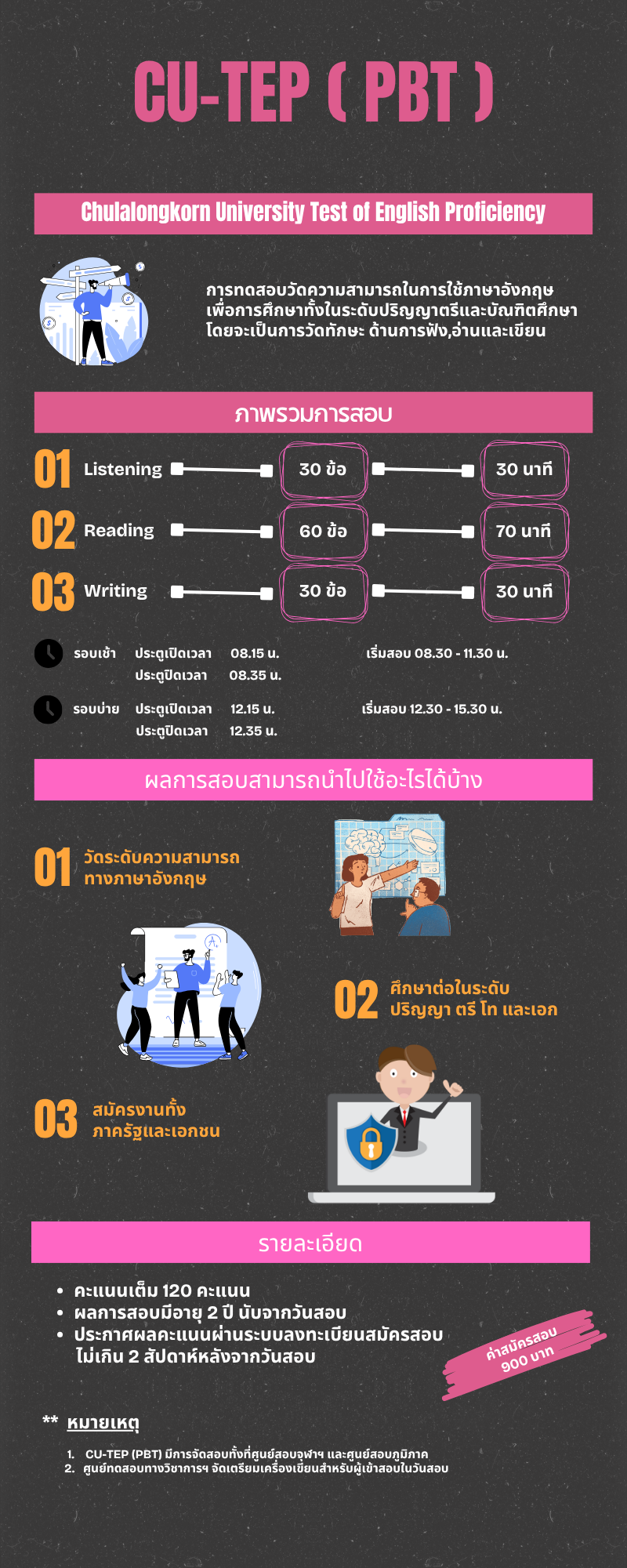 ขั้นตอนการสมัครสอบ อ่านขั้นตอนการสมัครสอบ คลิกที่นี่ ข้อปฏิบัติสำหรับผู้เข้าสอบ หลักฐานการแสดงตนเพื่อเข้าสอบ การแต่งกายในวันสอบ คลิกเพื่ออ่านรายละเอียด เข้าสู่ระบบ สมัครสอบ ตรวจสอบสถานที่สอบ หรือตรวจสอบผลคะแนน เข้าสู่ระบบ ดาวน์โหลด ดาวน์โหลดรอบการสอบประจำปี คลิกที่นี่