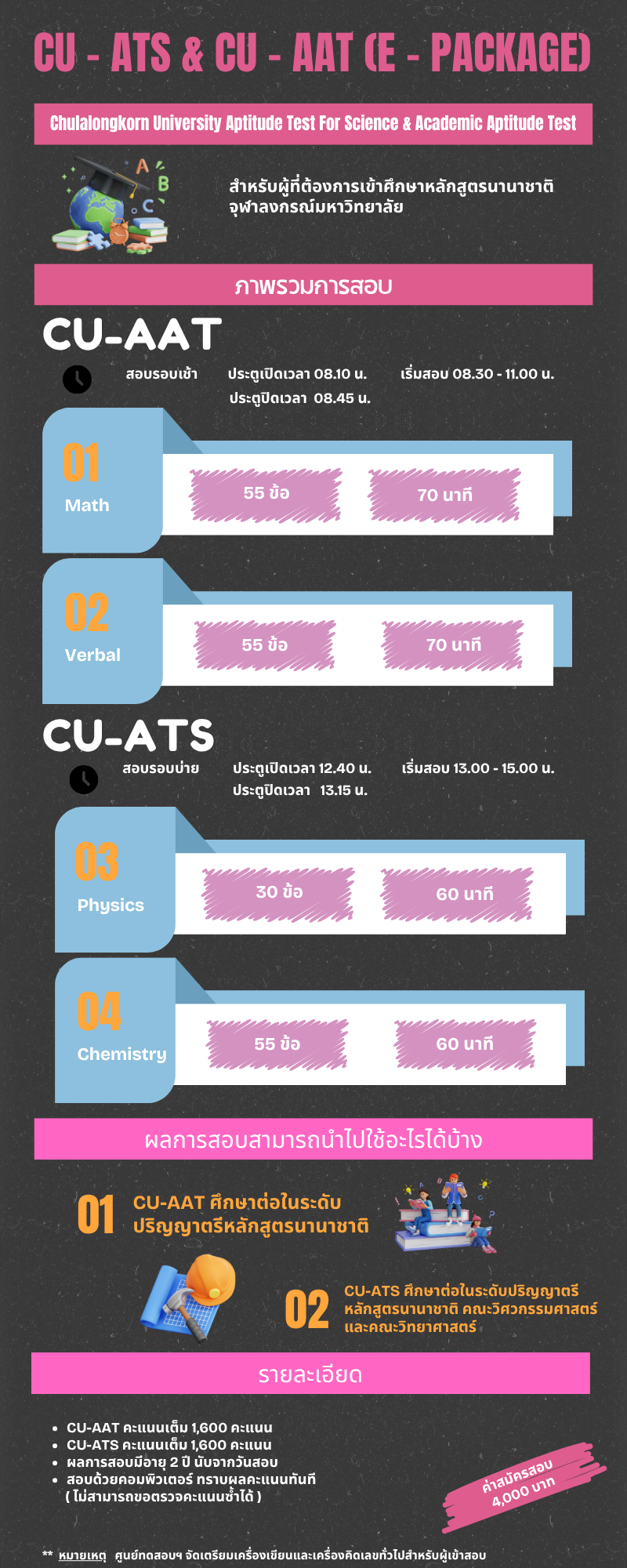 ขั้นตอนการสมัครสอบ อ่านขั้นตอนการสมัครสอบ คลิกที่นี่ ข้อปฏิบัติสำหรับผู้เข้าสอบ หลักฐานการแสดงตนเพื่อเข้าสอบ การแต่งกายในวันสอบ คลิกเพื่ออ่านรายละเอียด เข้าสู่ระบบ สมัครสอบ ตรวจสอบสถานที่สอบ หรือตรวจสอบผลคะแนน เข้าสู่ระบบ ดาวน์โหลด ดาวน์โหลดรอบการสอบประจำปี คลิกที่นี่